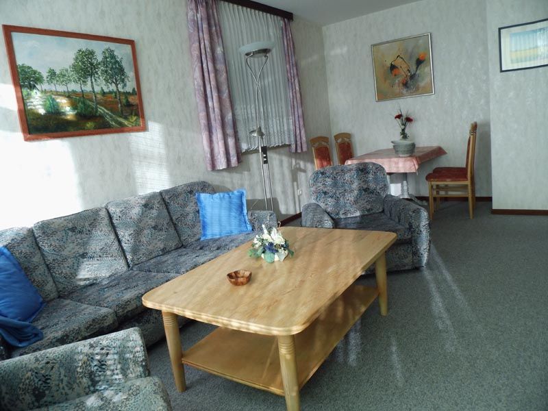 Eckcouch, Couchtisch, Sessel, Stehlampe, 2 Schrankeinzelbetten, Kleiderschrank. TV-Schrank, Sat-TV, Radio, Esstisch, 4 Stühle bzw. Essecke
